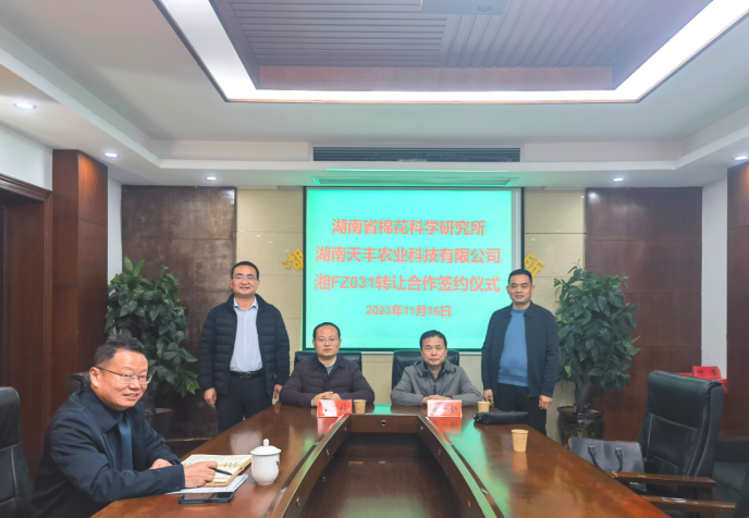 2023年11月16日,湖南省棉花科學研究所分別與湖南天豐農業(yè)科技有限公司、湖南湘穗種業(yè)有限責任公司在省棉科所會議室舉行了國審棉花新品種湘FZ031和湘XH50生產經營權轉讓簽約儀式。省棉科所黨委書記、所長李鋒與兩家公司董事長分別代表雙方簽約。這兩個國審品種的成功轉化,標志著省棉科所在科技成果轉化上取得了新的重大進展。
