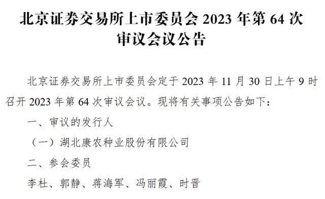 據(jù)北交所網(wǎng)站消息,北交所上市委員會(huì)定于2023年11月30日上午9時(shí)召開(kāi)2023年第64次審議會(huì)議,審議的發(fā)行人為湖北康農(nóng)種業(yè)股份有限公司(以下簡(jiǎn)稱“康農(nóng)種業(yè)”)。