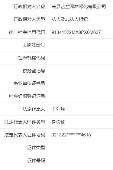 行政相對人名稱:蕭縣藝竺園林綠化有限公司