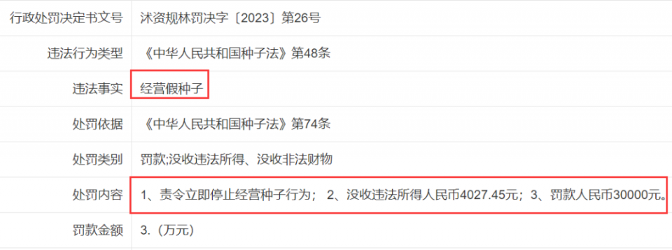 處罰內(nèi)容:1、責(zé)令立即停止經(jīng)營種子行為;2、沒收違法所得人民幣4027.45元;3、罰款人民幣30000元。