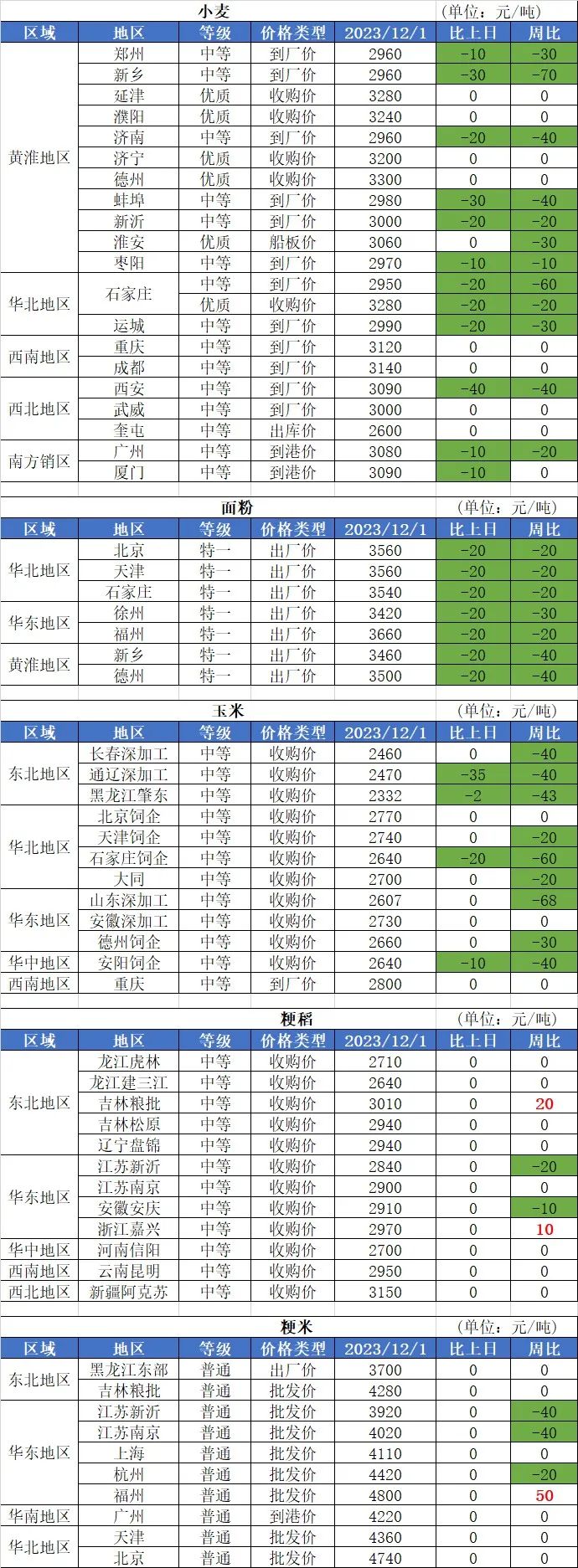 1、12月1日小麥價(jià)格繼續(xù)全面下跌,今日市場(chǎng)跌勢(shì)沒有任何放緩的跡象,甚至跌價(jià)企業(yè)范圍和速度明顯加快,主產(chǎn)區(qū)收購(gòu)價(jià)格范圍1.46-1.532元/斤,收購(gòu)均價(jià)1.486元/斤,較昨日下跌8厘/斤。
