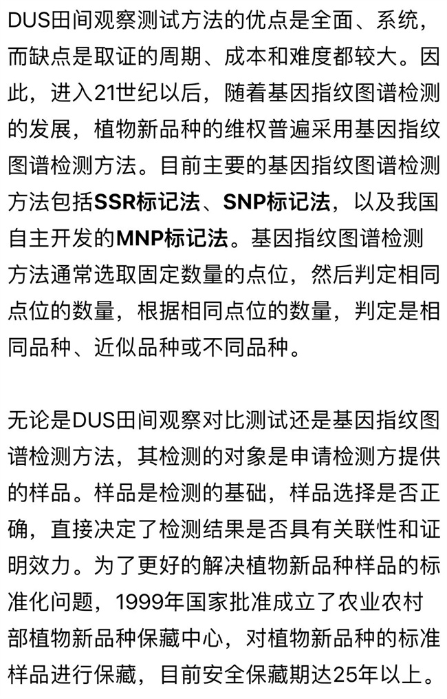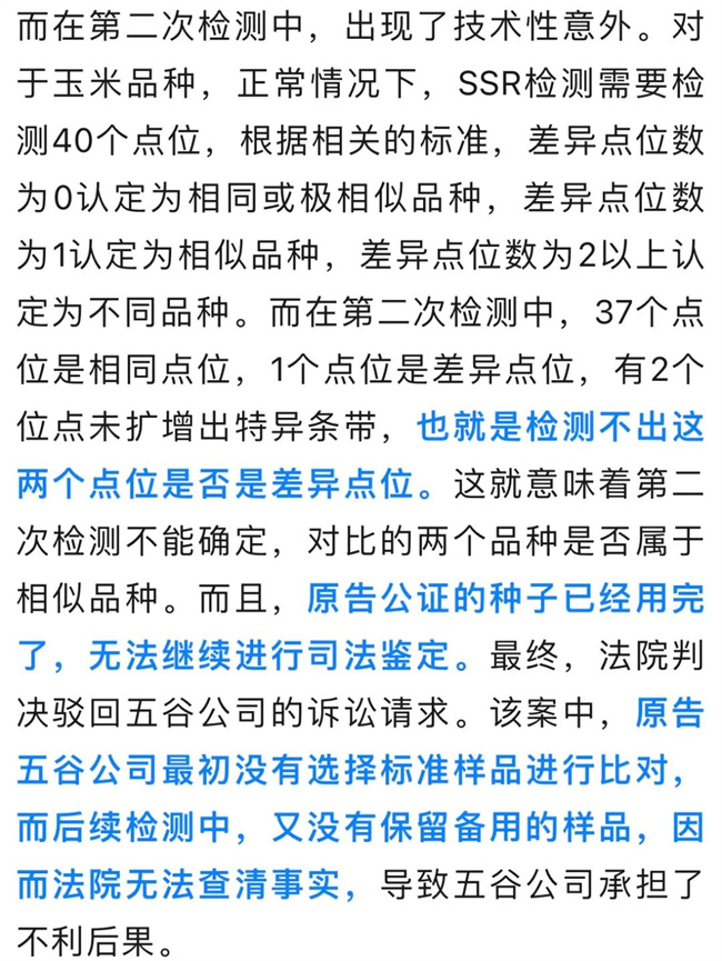 在“彩甜糯866”案件中,原告恒彩公司提交了檢測報告,采用SSR標記法進行檢測,共比較40個位點,差異位點數(shù)均為0,判定為極近似或相同品種。被告鄭州華為種業(yè)公司對檢測樣品提出質(zhì)疑,認為無法證明送檢的樣品為公證保存的樣品。被告鄭州華為種業(yè)公司也提交檢測報告,采用SSR標記法對鄭州華為種業(yè)公司提供的送檢樣品“彩甜糯866”和對比樣品“彩甜糯6號”進行檢測,經(jīng)用40對SSR引物進行DNA譜帶數(shù)據(jù)比對,差異位點數(shù)為35,判定為不同品種。