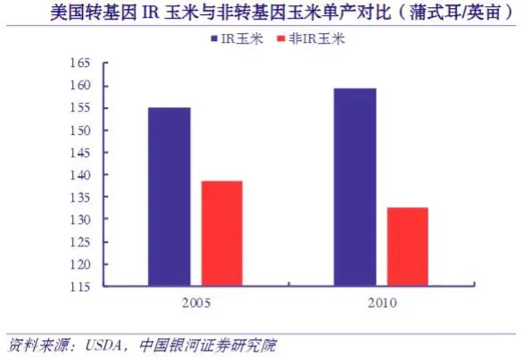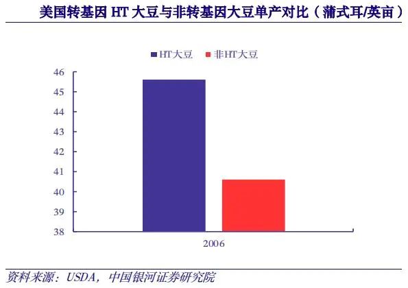 以美國為例,根據(jù)USDA數(shù)據(jù),2006年美國轉(zhuǎn)基因HT耐除草劑大豆相比非轉(zhuǎn)基因大豆單產(chǎn)高出12.32%;2010年美國轉(zhuǎn)基因IR抗蟲玉米相比2010 年同期美國非轉(zhuǎn)基因玉米單產(chǎn)高出19.97%。