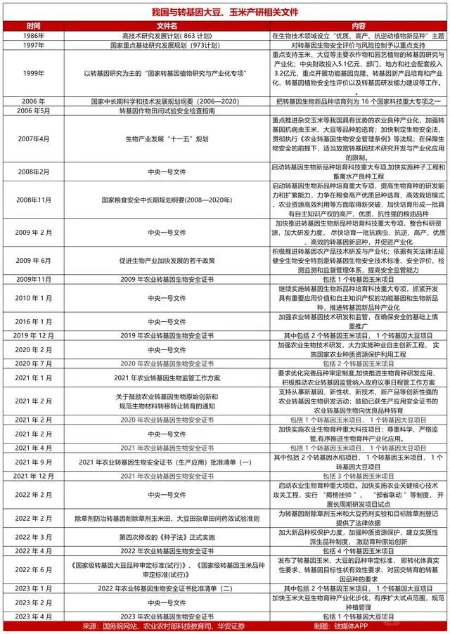 1986年3月開始實(shí)施的“高技術(shù)研究發(fā)展計(jì)劃”,即“863”計(jì)劃為我國轉(zhuǎn)基因大業(yè)拉開了序幕。玉米、大豆作為飼料作物、油料作物,對養(yǎng)殖、食品行業(yè)影響重大,因此備受重視。據(jù)不完全統(tǒng)計(jì),在過去三十多年中,政府推出的大豆、玉米相關(guān)的轉(zhuǎn)基因文件超過30份。