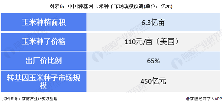 我國轉(zhuǎn)基因技術(shù)應(yīng)用的作物較少,若應(yīng)用至玉米,中國種業(yè)的市場空間將得到大幅的提升。2019年我國玉米的種植面積為6.3億畝,雜交玉米種子價(jià)格較低,約為56元/畝,若以美國一畝地玉米種子價(jià)格110元測算,我國轉(zhuǎn)基因玉米的終端市場收入空間達(dá)693億元,若出廠價(jià)按照65%的終端價(jià),市場空間為450億元。