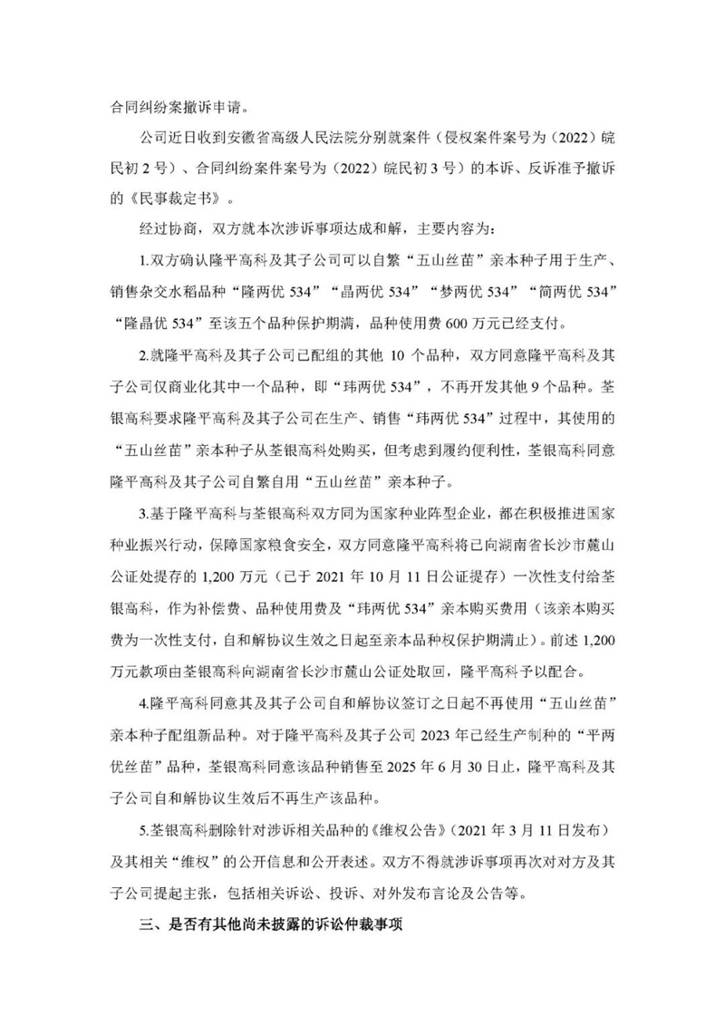 4、隆平高科同意其及其子公司自和解協(xié)議簽訂之日起不再使用“五山絲苗”親本種子配組新品種。對(duì)于隆平高科及其子公司 2023年已經(jīng)生產(chǎn)制種的“平兩優(yōu)絲苗”品種,荃銀高科同意該品種銷售至2025年6月30日止,隆平高科及其子公司自和解協(xié)議生效后不再生產(chǎn)該品種。
