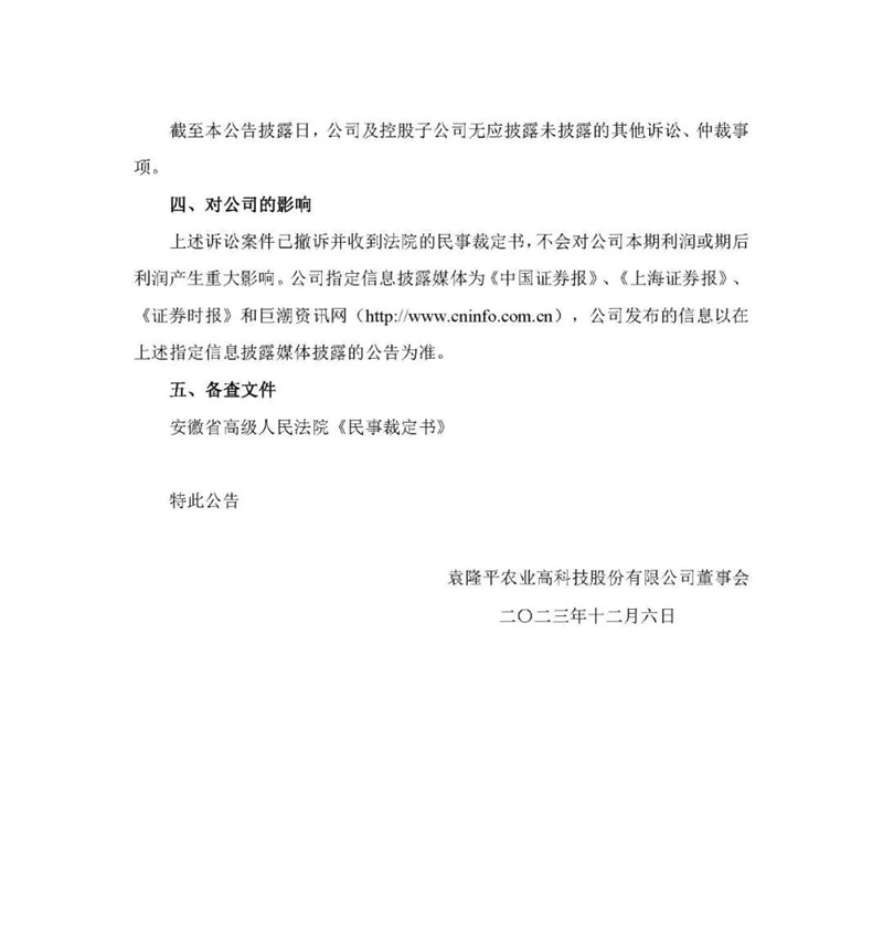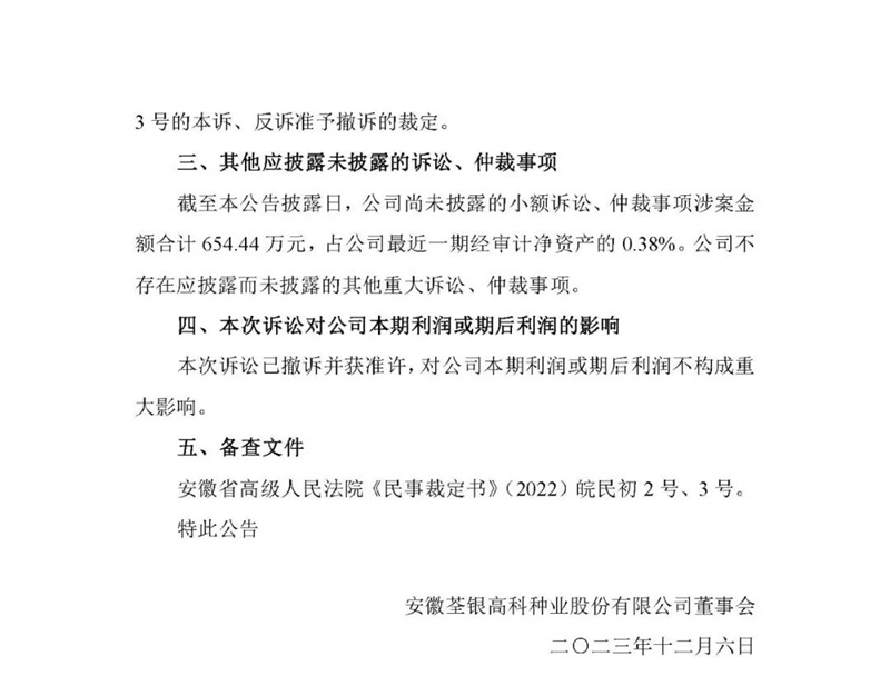 5.荃銀高科刪除針對(duì)涉訴相關(guān)品種的《維權(quán)公告》(2021 年 3 月 11 日發(fā)布) 及其相關(guān)“維權(quán)”的公開(kāi)信息和公開(kāi)表述。雙方不得就涉訴事項(xiàng)再次對(duì)對(duì)方及其子公司提起主張,包括相關(guān)訴訟、投訴、對(duì)外發(fā)布言論及公告等。