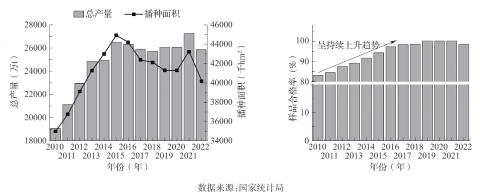 圖1 中國玉米播種面積、總產(chǎn)量和種子質(zhì)量(樣品合格率指標(biāo))變化趨勢