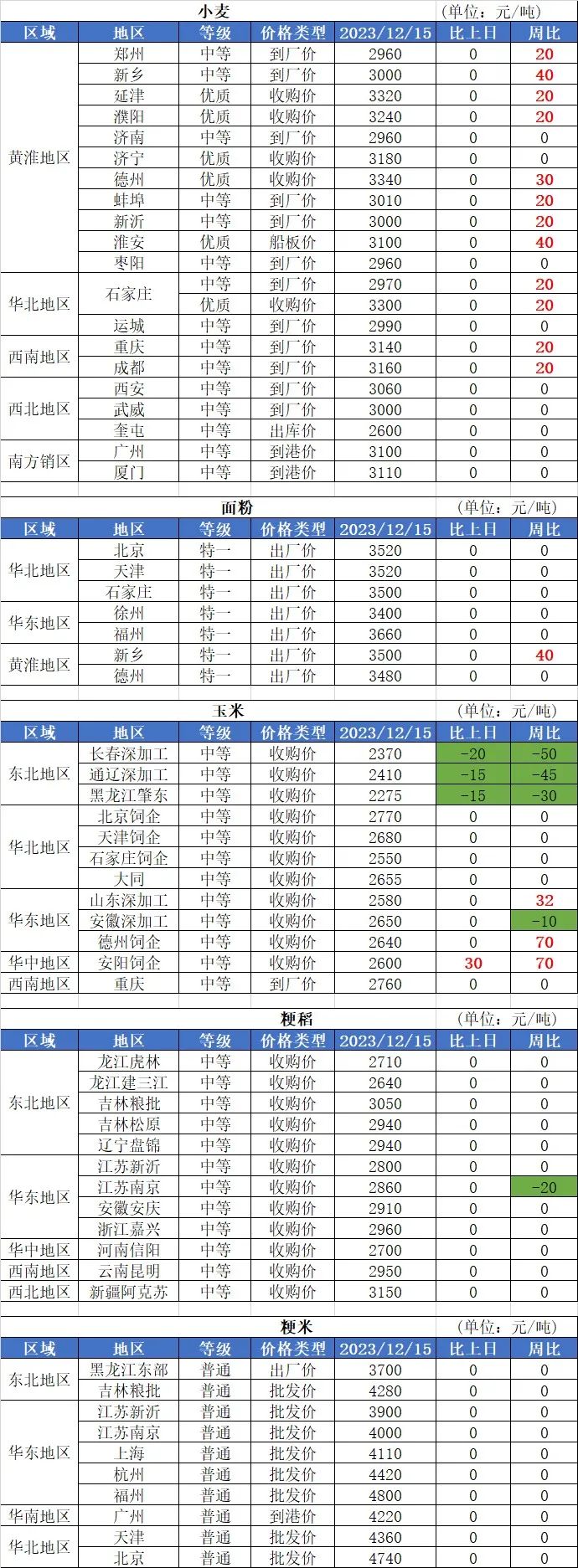 2、12月15日國內(nèi)玉米價格局部調(diào)整,其中:華北地區(qū)、南方銷區(qū)玉米價格基本穩(wěn)定;東北地區(qū)、南北港口玉米價格基本穩(wěn)定,局部價格小幅下跌,跌幅10-20元/噸。