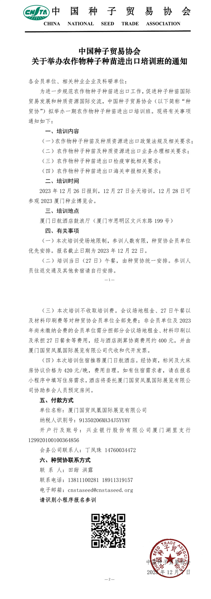 此外,為了進一步規(guī)范和幫助企業(yè)順利開展種子進出口業(yè)務,中國種子貿易協(xié)會將于12月27日在福建廈門組織相關培訓班,歡迎報名參會。