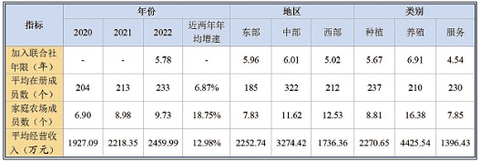 近年來(lái),我國(guó)合作社經(jīng)營(yíng)規(guī)模適度拓展,成員數(shù)量不斷增加,越來(lái)越多的合作社加入聯(lián)合社,合作社推動(dòng)小農(nóng)戶與現(xiàn)代農(nóng)業(yè)有機(jī)銜接的作用日益明顯。首先,合作社吸納成員數(shù)量不斷增加,成員類型更加多元,既包括小農(nóng)戶,也包括家庭農(nóng)場(chǎng)和專業(yè)大戶。從成員數(shù)量來(lái)看,500強(qiáng)合作社2022年平均在冊(cè)成員數(shù)為233個(gè),較上一年增長(zhǎng)9.62%。分區(qū)域看,中部地區(qū)、東部地區(qū)、西部地區(qū)合作社在冊(cè)成員數(shù)分別達(dá)到322個(gè)、185個(gè)、212個(gè),中部地區(qū)在冊(cè)成員數(shù)較全國(guó)平均水平高38.10%。從成員構(gòu)成來(lái)看,500強(qiáng)合作社成員中家庭農(nóng)場(chǎng)成員數(shù)量穩(wěn)步增加。2022年社均家庭農(nóng)場(chǎng)成員數(shù)量為9.73家,近兩年年均增長(zhǎng)18.75%。分區(qū)域看,西部地區(qū)、中部地區(qū)和東部地區(qū)合作社家庭農(nóng)場(chǎng)成員數(shù)量分別達(dá)到12.53個(gè)、11.62個(gè)、7.83個(gè),西部地區(qū)和中部地區(qū)數(shù)量較高;分行業(yè)看,養(yǎng)殖類、服務(wù)類、種植類合作社分別為16.38個(gè)、8.81個(gè)、7.85個(gè),養(yǎng)殖類合作社的家庭農(nóng)場(chǎng)成員數(shù)量較高。