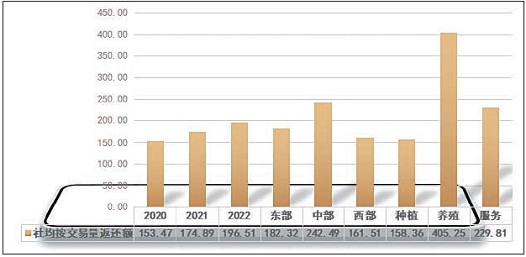 近年來(lái),500強(qiáng)合作社通過(guò)盈余返還、統(tǒng)一采購(gòu)和銷售等多種形式帶動(dòng)農(nóng)戶與脫貧戶,有效發(fā)揮了助農(nóng)增收的作用。500強(qiáng)合作社按交易量或交易額返還額持續(xù)提升。2022年500強(qiáng)合作社按交易量或交易額返還額總數(shù)為146251.38萬(wàn)元,較2021年增加6.80%。分地區(qū)看,中部地區(qū)合作社按交易量或交易額返還的金額最高,社均為242.49萬(wàn)元,東部和西部合作社社均按交易量或交易額返還的金額分別達(dá)到182.32萬(wàn)元和161.51萬(wàn)元;分行業(yè)看,養(yǎng)殖類合作社按交易量或交易額的返還金額最高,達(dá)到405.25萬(wàn)元,服務(wù)類和種植類按交易量或交易額的返還金額分別達(dá)到229.81萬(wàn)元和158.36萬(wàn)元。(詳見(jiàn)圖2)。2022年,500強(qiáng)合作社統(tǒng)一銷售農(nóng)產(chǎn)品總數(shù)、統(tǒng)一采購(gòu)農(nóng)資總數(shù)分別為1111085.74萬(wàn)元和357926.36萬(wàn)元,近兩年年均增長(zhǎng)率分別達(dá)到12.37%和7.87%。表明500強(qiáng)合作社在為農(nóng)戶統(tǒng)一采購(gòu)農(nóng)資、銷售農(nóng)產(chǎn)品中的作用正逐步增強(qiáng)。分地區(qū)看,東部地區(qū)合作社比例最高,達(dá)到了79.79%,高出地區(qū)平均水平1.96%;分行業(yè)看,養(yǎng)殖類合作社的比例最高,達(dá)到84.05%,高出行業(yè)平均水平6.22%。