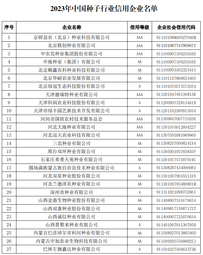 中國種子協(xié)會關(guān)于2023年中國種子行業(yè)信用評價(jià)結(jié)果的公告