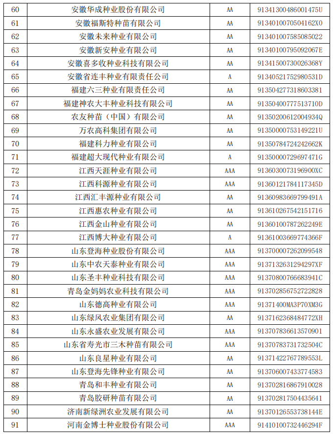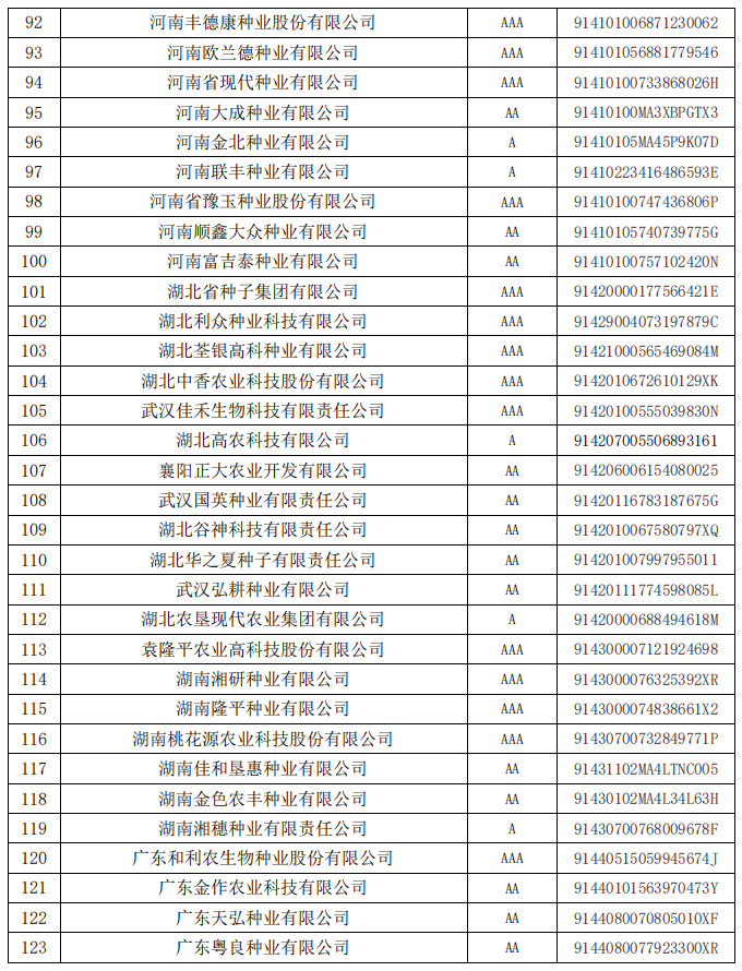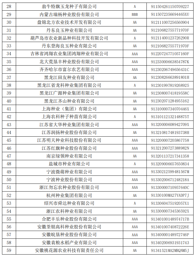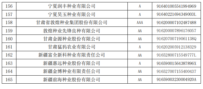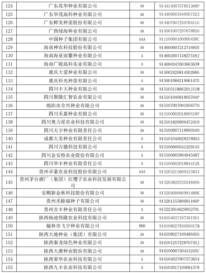 根據(jù)《中國種子協(xié)會行業(yè)信用評價(jià)管理辦法》的規(guī)定,中國種子協(xié)會對2020年獲得信用等級有效期滿、需要更換牌證的信用企業(yè)和2023年經(jīng)過省級信用評價(jià)小組初審的申報(bào)企業(yè),通過信用評價(jià)辦公室審核、專家評審、領(lǐng)導(dǎo)小組審定、公示等程序,共計(jì)確定了165家種子企業(yè)的信用等級,現(xiàn)予公告。
