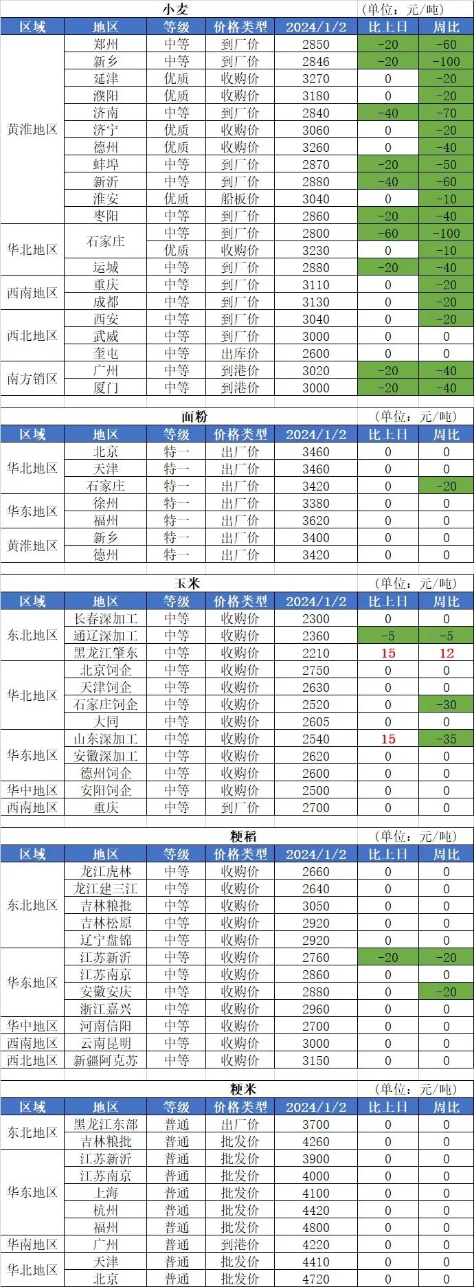 1、元旦假期,國內(nèi)小麥繼續(xù)大范圍下跌,跌幅0.5-3.0分/斤,多家制粉企業(yè)收購價跌至1.4元/斤,收購均價為1.428元/斤,較假期前下跌7厘/斤。