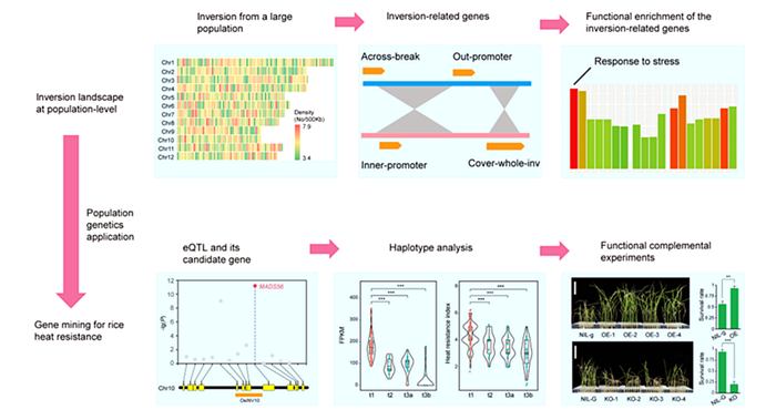 水稻中的基因組倒位變異是指染色體上的DNA序列發(fā)生斷裂脫落后,顛倒180度在斷裂處重新連接導(dǎo)致的DNA序列改變的現(xiàn)象,在水稻群體中普遍存在。為了更好地探究倒位變異對(duì)水稻基因結(jié)構(gòu)和基因功能的影響,科研人員對(duì)全球377份栽培稻和野生稻基因組中的倒位變異進(jìn)行深度分析,發(fā)現(xiàn)參與逆境響應(yīng)的基因明顯地集中于倒位之內(nèi)或其周圍,證實(shí)了倒位變異與水稻抗逆性之間緊密相聯(lián)。研究進(jìn)一步利用水稻基因組倒位變異圖譜成功發(fā)掘獲得了一個(gè)新的水稻耐熱優(yōu)異等位基因,該基因主要存在于大多數(shù)秈稻群體以及少量的粳稻群體之中,可用于下一步選育新的耐熱水稻品種。該研究為充分挖掘水稻倒位變異的遺傳潛力奠定了堅(jiān)實(shí)的理論基礎(chǔ),為水稻分子育種和遺傳改良提供了富有啟發(fā)性和可行性的新途徑。
