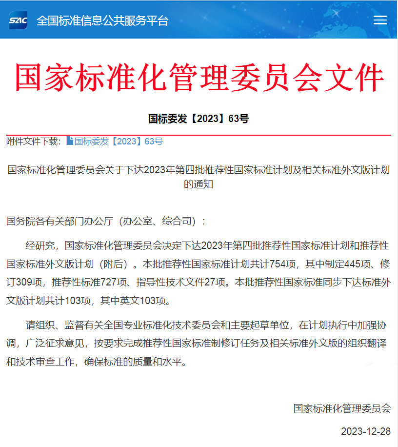 近日,國家標準化管理委員會發(fā)布關(guān)于下達2023年第四批推薦性國家標準計劃及相關(guān)標準外文版計劃的通知(國標委發(fā)〔2023〕63號),下達推薦性國家標準計劃754項,下達標準外文版計劃共計103項,其中英文103項。