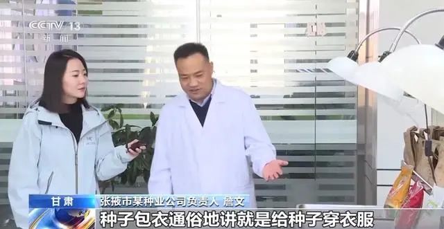 張掖市某種業(yè)公司負責(zé)人 詹文:種子包衣,通俗地說就是給種子穿衣服,保護種子不被地下蟲害、病菌所危害,同時提高種子抗低溫等不良環(huán)境的作用。