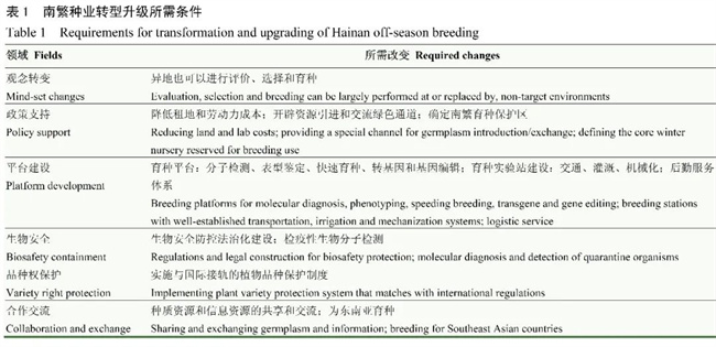 文章在分析了海南地理生態(tài)優(yōu)勢與南繁種業(yè)現(xiàn)狀之后,討論了南繁種業(yè)的轉(zhuǎn)型升級及其所需條件。實現(xiàn)南繁種業(yè)的轉(zhuǎn)型升級有賴于異地選擇觀念的轉(zhuǎn)變、國家相關(guān)政策的支持、分子育種平臺的支撐、生物安全防控和品種保護制度的建立和完善、資源共享和交流機制的形成(表1)。