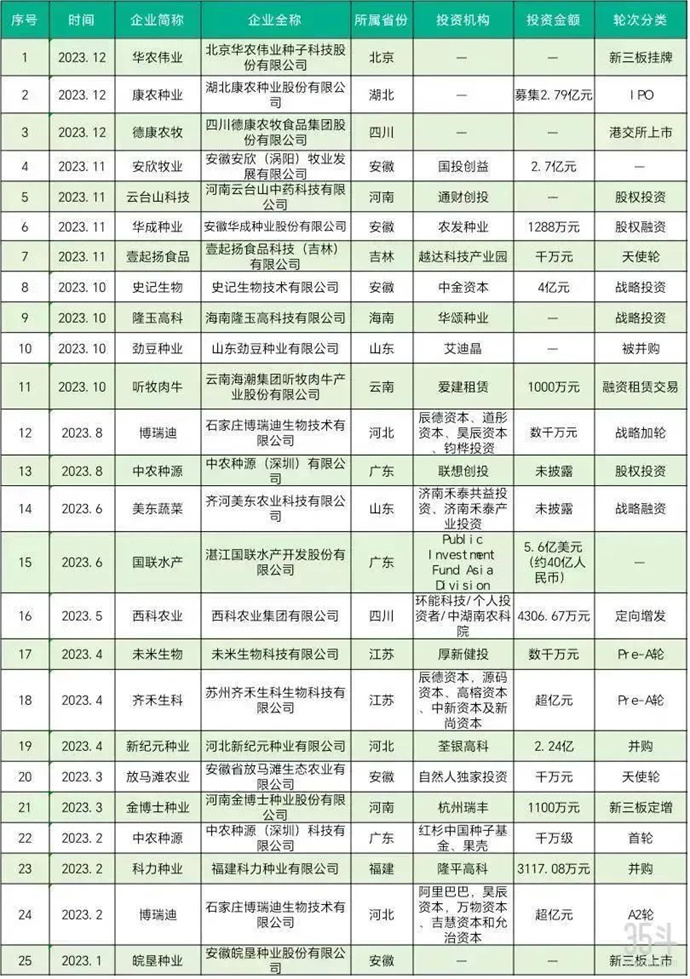 2023年成功敲響IPO鐘聲種業(yè)企業(yè)數(shù)量相較于去年明顯上升。35斗去年發(fā)布的《種業(yè)創(chuàng)新這一年,創(chuàng)投資金流入超30億,“AI+育種”“數(shù)據(jù)+育種”風(fēng)口漸成【2022年年度盤點】》種業(yè)創(chuàng)新這一年,創(chuàng)投資金流入超30億,“AI+育種”“數(shù)據(jù)+育種”風(fēng)口漸成【2022年年度盤點】一文中表明,2022年間,僅秋樂種業(yè)和綠亨科技IPO成功。2023年,皖墾種業(yè)新三板上市,德康農(nóng)牧港交所上市,康農(nóng)種業(yè)成功IPO,華農(nóng)偉業(yè)實現(xiàn)新三板掛牌。2023年,我國種業(yè)賽道在IPO企業(yè)的數(shù)量上實現(xiàn)了翻番,種業(yè)行業(yè)資本化正經(jīng)歷“升溫”。