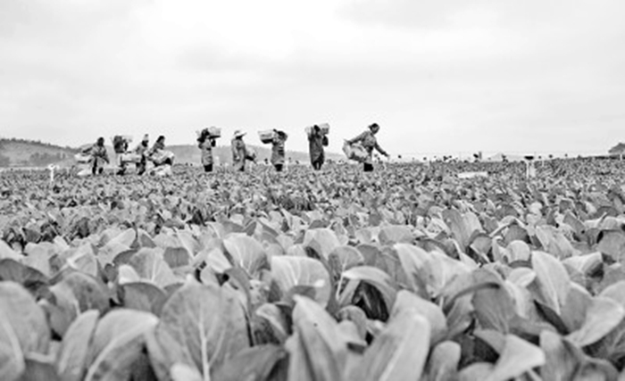 在云南省文山壯族苗族自治州硯山縣,農(nóng)民在一家蔬菜基地收獲蔬菜。