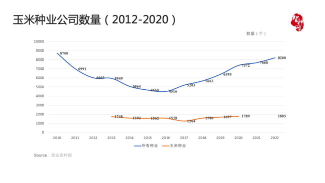 隨著“放管服”,種業(yè)振興行動方案,提升自主創(chuàng)新能力是種業(yè)發(fā)展的解決種子卡脖子的必要條件及核心。我國玉米種源“卡脖子”問題嚴峻,玉米種業(yè)具備一定育種能力,但質量不高。整體來看,目前我國玉米種子企業(yè)競爭激烈,同質化嚴重,格局較分散,集中度較低。