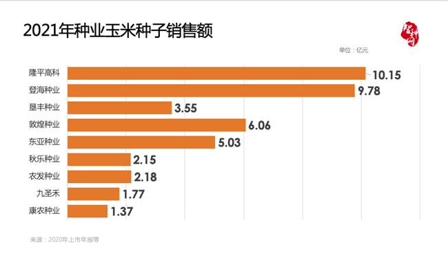 第一梯隊在 7-10 億左右,包括隆平高科和登海種業(yè),2021 年玉米種子營業(yè)收入分別為 10.15 億元和 9.78 億元。第二梯隊在 3-7 億元左右,包括敦煌種業(yè)、遼寧東亞和墾豐種業(yè),2021 年玉米種子營業(yè)收入分別為 6.06 億元、5.03 億元和 3.55 億元。其中,敦煌種業(yè)和遼寧東亞近三年玉米種子營收呈現強勢增長態(tài)勢,2021年增幅分別為55.39%和30.65%;墾豐種業(yè)近三年玉米種子營收呈現下降態(tài)勢,2021 年降幅為34.77%。第三梯隊在 3 億元以下,包括農發(fā)種業(yè)、秋樂種業(yè)、九圣禾和湖北康農,2021 年玉米種子營業(yè)收入分別為2.18億元、2.15億元、1.77億元和1.37億元。不過2022年隆平高科高科和登海種業(yè)玉米種子銷售額都超過10億。
