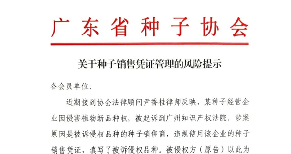 近日,廣東省種子協會發(fā)布一則《關于種子銷售憑證管理的風險提示》,提示顯示某種子經營企業(yè)因侵害植物新品種權,被起訴到廣州知識產權法院。