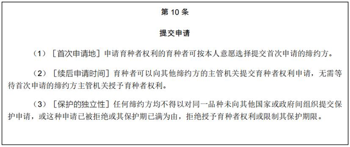 植物育種者權(quán)利申請條款載于《UPOV公約》1991年文本第10條: