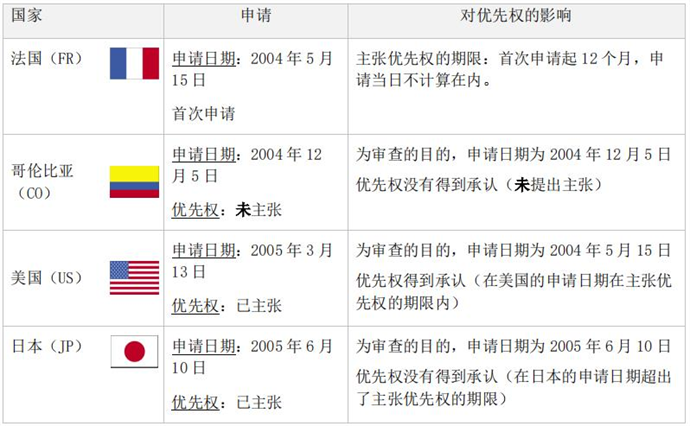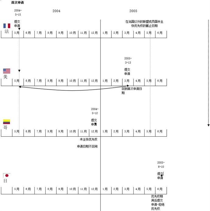我們假設(shè)一個案例:有一個育種者在不同時間向法國、哥倫比亞、美國和日本這四個聯(lián)盟成員主管機關(guān)申請同一品種的植物育種者權(quán)利,我們來分析一下該案例中優(yōu)先權(quán)的后果。