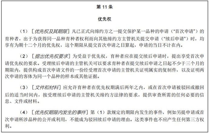《UPOV公約》第11條規(guī)定了為期一年的優(yōu)先權(quán),以同一品種在聯(lián)盟另一成員的在先申請為基礎(chǔ)。因此,后續(xù)申請被視為于在先申請的申請日提交。