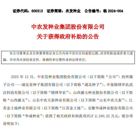 農(nóng)發(fā)種業(yè)1月22日晚間發(fā)布公告稱,2023年12月,中農(nóng)發(fā)種業(yè)集團股份有限公司的所屬子公司湖北省種子集團有限公司、中墾錦繡華農(nóng)武漢科技有限公司、山西潞玉種業(yè)股份有限公司、山東中農(nóng)天泰種業(yè)有限公司、江蘇金土地種業(yè)有限公司、安徽華成種業(yè)股份有限公司獲得了相關(guān)政府補助款項共計2240.22萬元。