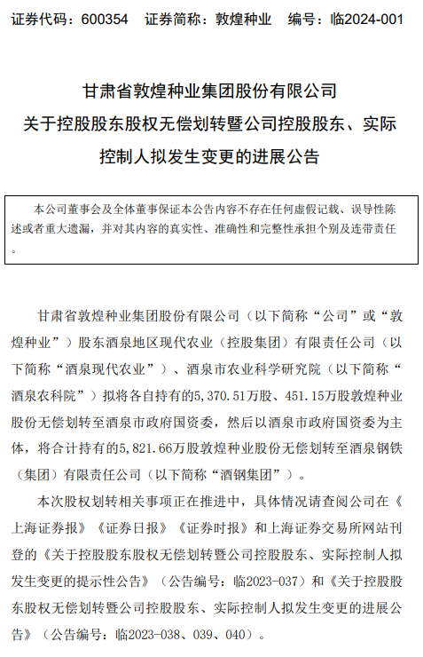 敦煌種業(yè)1月24日公告披露,甘肅省敦煌種業(yè)集團股份有限公司(以下簡稱“敦煌種業(yè)”)股東酒泉地區(qū)現(xiàn)代農(nóng)業(yè)(控股集團)有限責(zé)任公司(以下簡稱“酒泉現(xiàn)代農(nóng)業(yè)”)、酒泉市農(nóng)業(yè)科學(xué)研究院(以下簡稱“酒泉農(nóng)科院”)擬將各自持有的5,370.51萬股、451.15萬股敦煌種業(yè)股份無償劃轉(zhuǎn)至酒泉市政府國資委,然后以酒泉市政府國資委為主體,將合計持有的5,821.66萬股敦煌種業(yè)股份無償劃轉(zhuǎn)至酒泉鋼鐵(集團)有限責(zé)任公司(以下簡稱“酒鋼集團”)。