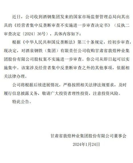 公告還披露,公司收到酒鋼集團發(fā)來的國家市場監(jiān)督管理總局向其出具的《經(jīng)營者集中反壟斷審查不實施進一步審查決定書》(反執(zhí)二審查決定〔2024〕36號),經(jīng)初步審查,現(xiàn)決定,對酒泉鋼鐵(集團)有限責(zé)任公司收購甘肅省敦煌種業(yè)集團股份有限公司股權(quán)案不實施進一步審查。