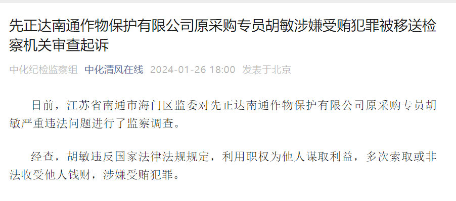 據(jù)“中化清風(fēng)在線”1月26日消息,日前,江蘇省南通市海門區(qū)監(jiān)委對先正達(dá)南通作物保護(hù)有限公司原采購專員胡敏嚴(yán)重違法問題進(jìn)行了監(jiān)察調(diào)查。