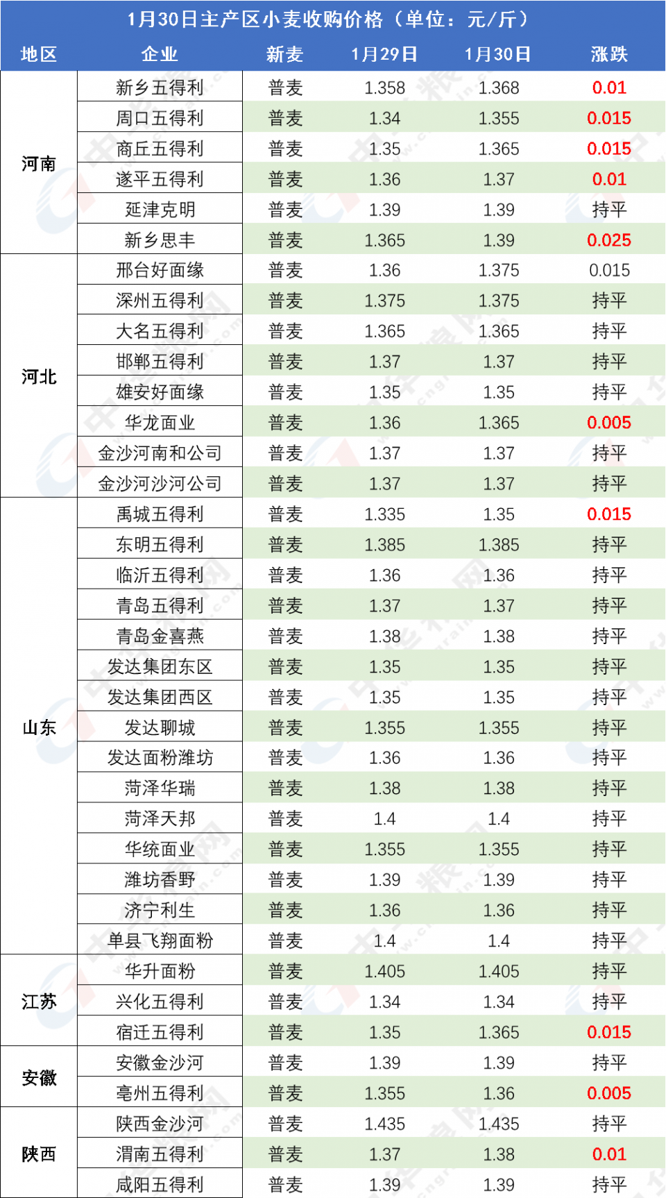 1月30日主產(chǎn)區(qū)面粉廠小麥?zhǔn)召弮r(jià)格