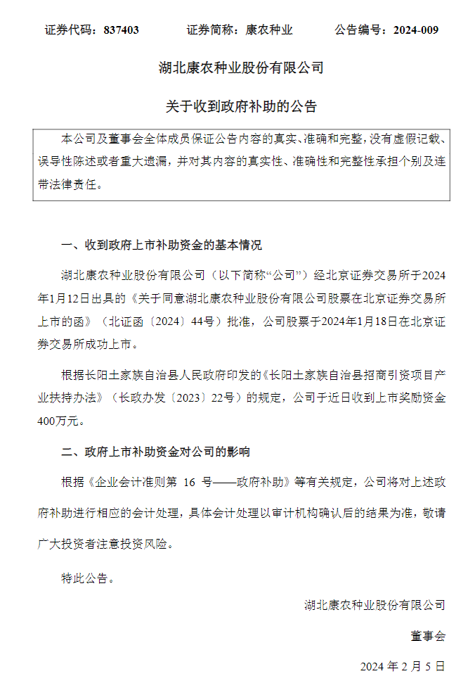2月6日,湖北康農(nóng)種業(yè)股份有限公司發(fā)布關(guān)于收到政府補助的公告。公告如下: