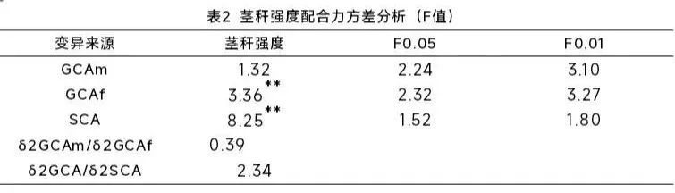 注:CK1是鄭單958、CK2是先玉335此外,對莖稈強度進(jìn)行配合力方差分析(表2),從中可知,母本莖稈強度的一般配合力方差達(dá)到了極顯著水平,特殊配合力方差也達(dá)到了極顯著的水平,說明莖稈強度都受加性效應(yīng)和非加性效應(yīng)的影響。