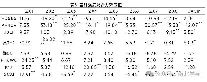 ZX1的一般配合力效應(yīng)值最大,但是組合ZX1×PH6WC的特殊力效應(yīng)值卻達(dá)到了負(fù)的極顯著水平,說明在莖稈強度方面,一般配合力和特殊配合力沒有必然的相關(guān)性,說明了基因互作的復(fù)雜性。