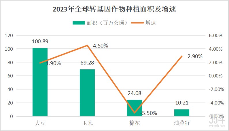 從品種結(jié)構(gòu)來(lái)看,大豆、玉米、棉花、油菜是主要的轉(zhuǎn)基因種植作物,全球種植面積分別為1.0089億公頃、6928萬(wàn)公頃、2408萬(wàn)公頃、1021萬(wàn)公頃,分別占總面積的48.91%、33.59%、11.67%、4.95%。