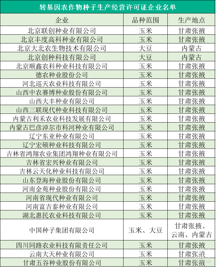 2023年12月25日,農(nóng)業(yè)農(nóng)村部發(fā)布公告,37個(gè)轉(zhuǎn)基因玉米品種和10個(gè)轉(zhuǎn)基因大豆品種獲得生產(chǎn)經(jīng)營(yíng)許可證,共涉及26家企業(yè)。
