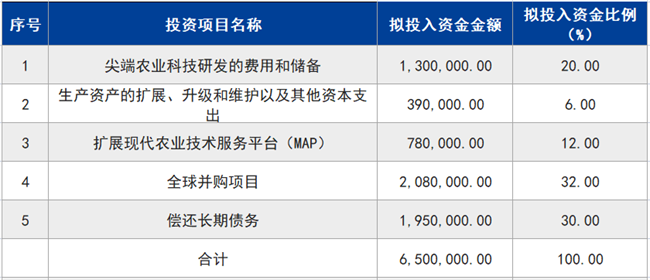 近期,先正達(dá)宣布完成對(duì)巴西蔬菜種子公司Feltrin Sementes的收購(gòu)。據(jù)其招股書顯示,本次發(fā)行上市所募集資金扣除發(fā)行費(fèi)用后,將投資于尖端農(nóng)業(yè)科技研發(fā)的費(fèi)用和儲(chǔ)備、生產(chǎn)資產(chǎn)的擴(kuò)展、擴(kuò)展現(xiàn)代農(nóng)業(yè)技術(shù)服務(wù)平臺(tái)(MAP)等5個(gè)項(xiàng)目。