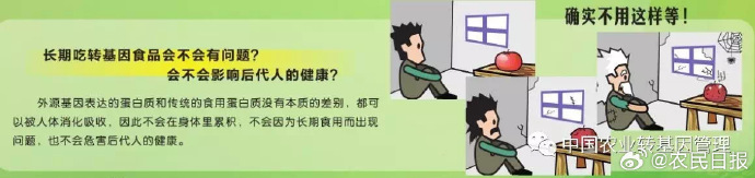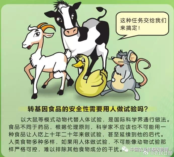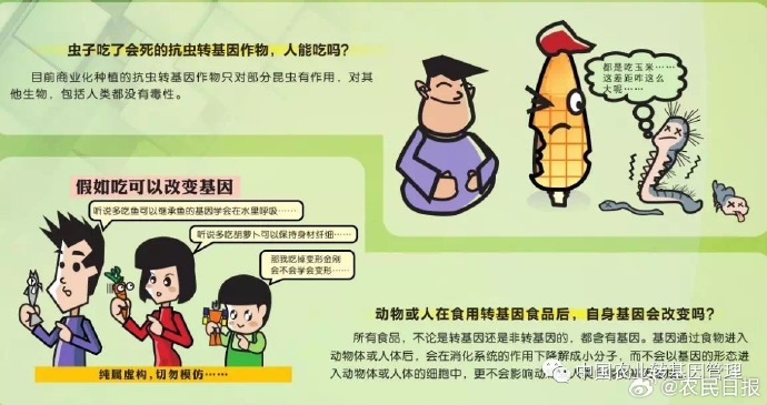 作物,人能吃嗎?動(dòng)物或人在食用轉(zhuǎn)基因食品后,自身基因會(huì)改變嗎?長(zhǎng)期吃轉(zhuǎn)基因食品會(huì)不會(huì)有問(wèn)題?轉(zhuǎn)基因食品的安全性需要用人做試驗(yàn)嗎?轉(zhuǎn)基因安全性有定論嗎?看下圖了解詳情。