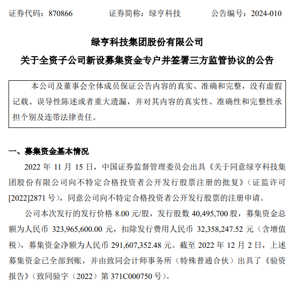 綠亨科技:全資子公司新設(shè)募集資金專戶,募資總額3.2億元