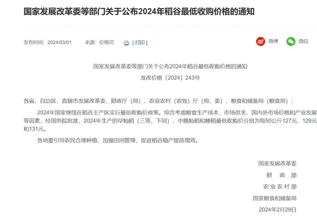 關(guān)于2024年稻谷最低收購(gòu)價(jià)有關(guān)政策的通知