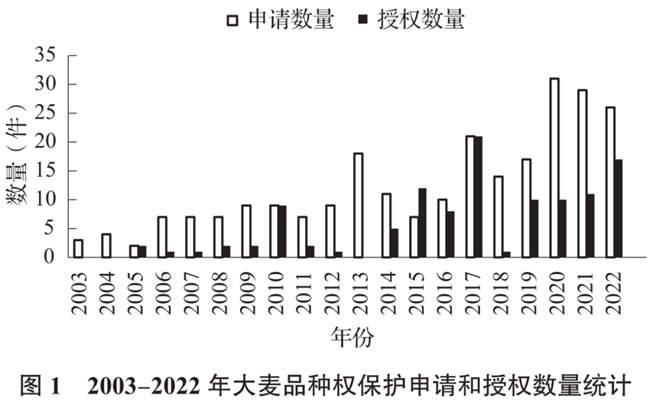 本文通過對我國2003-2022年申請植物新品種權保護的大麥品種進行統(tǒng)計整理,從大麥品種權保護申請和授權情況、申請主體和地區(qū)分布情況以及品種類型等幾個方面分析了我國大麥植物新品種保護現狀,以期為我國大麥品種權保護、種質資源有效利用以及實質性派生品種鑒定研究提供參考依據。