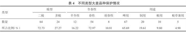 由表4可知,從棱型看,大麥品種保護中二棱大麥64件,占已知大麥棱型品種(88個)的72.73%;多棱大麥24件,占已知大麥棱型品種的27.27%。從冬春性看,春性大麥54件,占已知大麥冬春性品種(74個)的72.97%;其次是半冬性大麥12件,占已知大麥冬春性品種的16.22%;弱春性大麥8件,占已知大麥冬春性品種的10.81%。從品種用途看,啤用型大麥67件,占已知大麥用途品種(102個)的65.69%;其次是飼用大麥20件,占已知大麥用途品種的19.61%;糧用和糧草兼用型大麥分別是10件和5件,占已知大麥用途品種的9.80%和4.90%,說明我國進行品種權保護的大麥品種類型以春性、二棱、啤用大麥為主。
