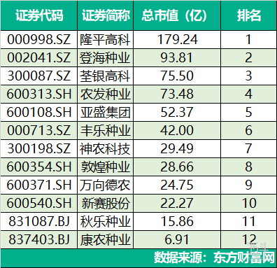最新市值排名中,隆平高科仍是行業(yè)龍頭,總市值179.24億遙遙領(lǐng)先,排名第一。同時(shí),敦煌種業(yè)表示未來公司管理層將會(huì)重視市值的管理工作,進(jìn)一步舉措將會(huì)具體公告。