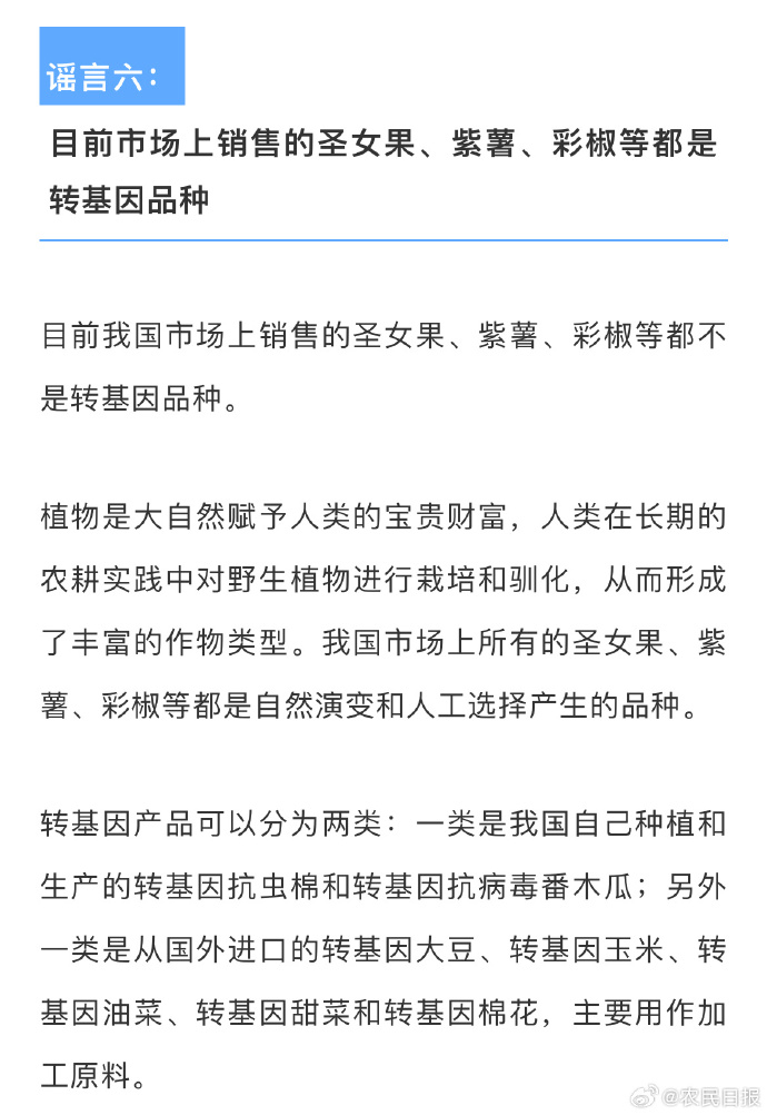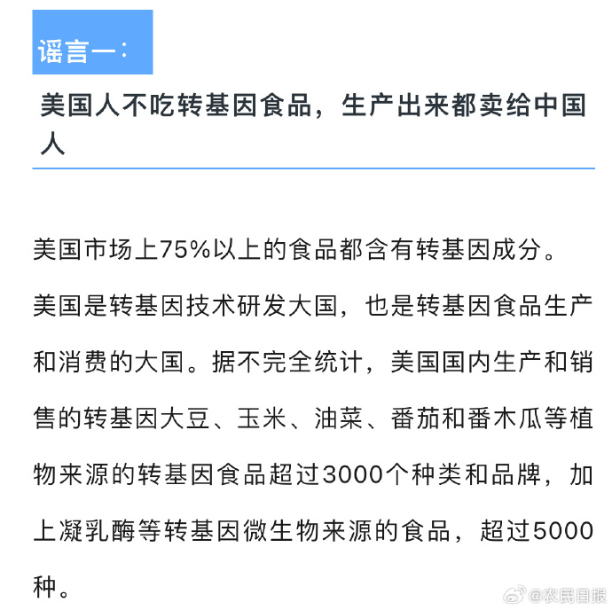 ,頻頻在網(wǎng)絡(luò)上傳出“圣女果都是轉(zhuǎn)基因”“美國人從來不吃轉(zhuǎn)基因”等虛假消息。這些謠言里你聽過幾個?其實(shí),美國是轉(zhuǎn)基因食品生產(chǎn)和消費(fèi)大國,抗蟲轉(zhuǎn)基因作物對人是無害的??聪聢D了解真相。