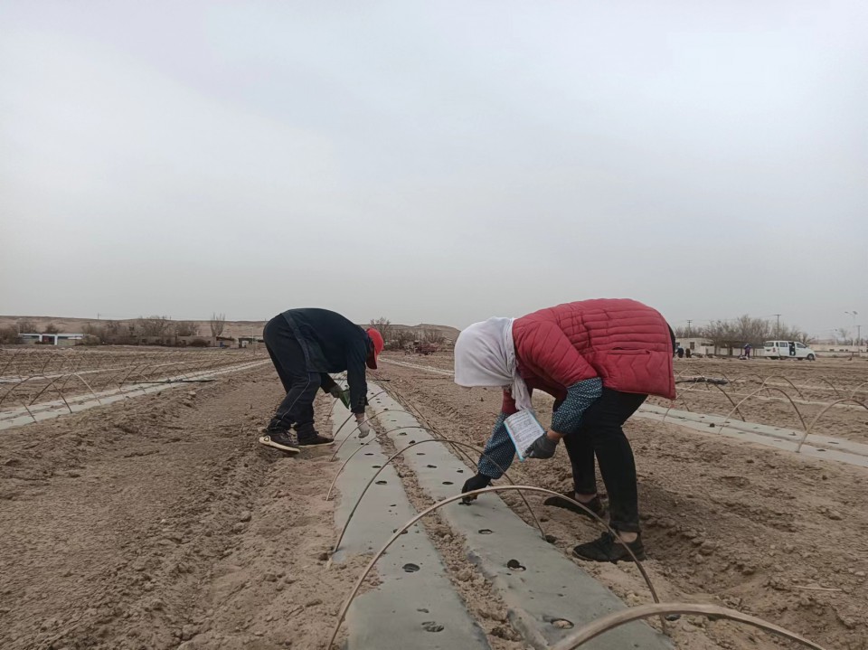 3月15日,新疆哈密市伊州區(qū)南湖鄉(xiāng)紅山村的瓜農(nóng)們正在進行哈密瓜點種。通過機械打好的農(nóng)膜點種孔,農(nóng)民把種子手工投入苗穴,并封好土,確保種子吸收養(yǎng)分。南湖鄉(xiāng)哈密瓜種植都采用了“干播濕出”技術(shù)。點籽封土后,架上小拱棚,再通過滴灌帶澆水后,就可以靜等出苗了。